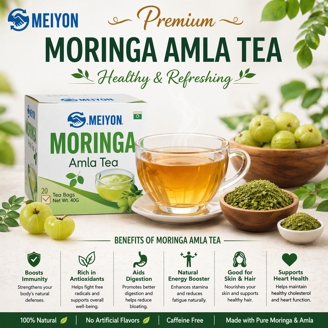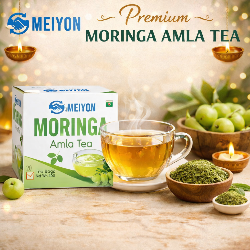 Moringa Amla Tea is a nourishing, caffeine-free blend of Moringa leaves and Amla (Indian gooseberry), both celebrated for their rich vitamin and antioxidant content. This herbal tea helps boost immunity, supports healthy digestion, and promotes radiant skin. With its mildly tangy, refreshing taste, it’s an ideal health drink for daily wellness and vitality.